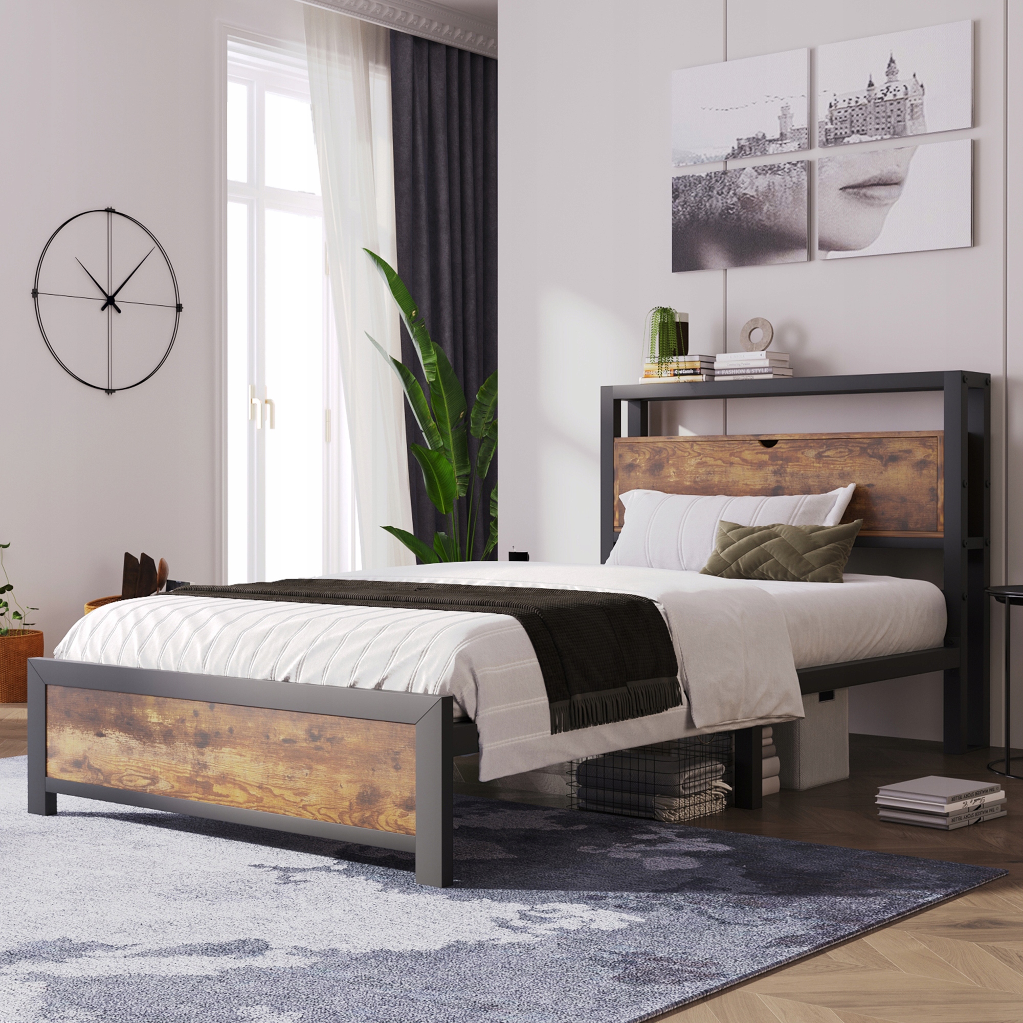 Łóżko metalowe łóżka młodzieżowe łóżko pojedyncze 90 x 200 cm z głowicą miejsca do przechowywania i metalową ramą z listew, rama łóżka z metalu do łóżeczka rama łóżka dla dorosłych, dzieci, nastolatków, czarne łóżko przemysłowe (bez materaca)
